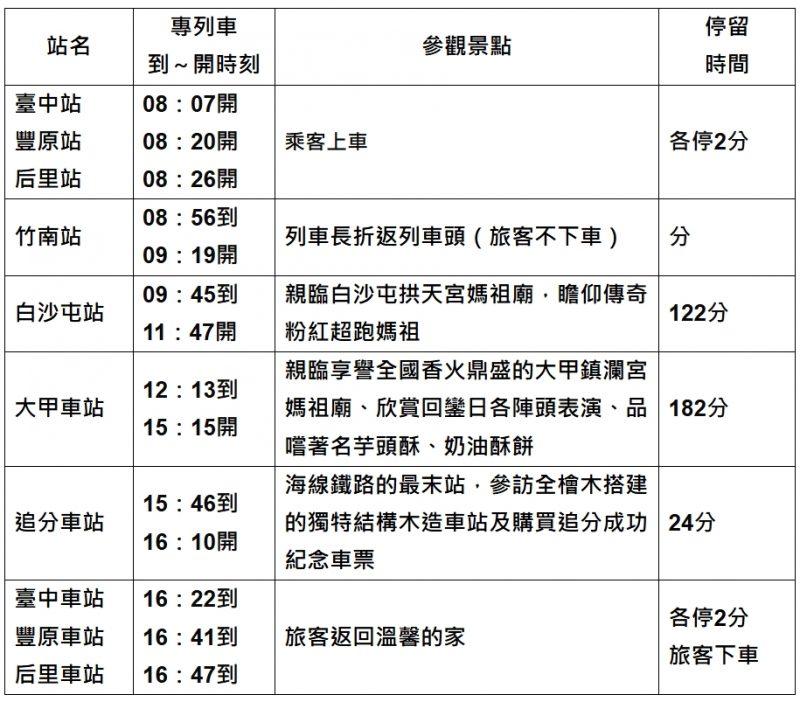 旅遊行程時刻表(實際停靠與開車時間依台鐵當日專用列車時刻表)